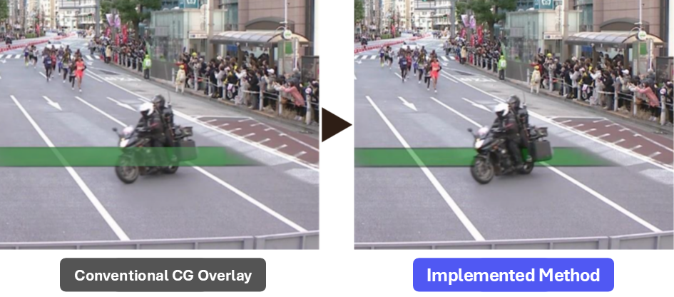 To address this issue, image recognition is used to detect people and vehicles in the foreground in real time, and a masking process is applied to recreate natural depth, allowing record pace lines to pass behind runners and lead bikes. This eliminates visual inconsistencies and enables clear, immersive visuals without compromising the realism of the race.